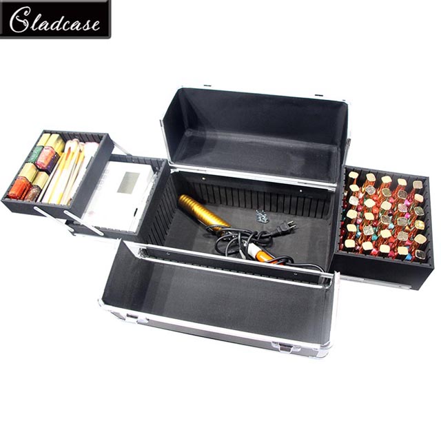Top layer : With handle , and one big tray at one side , the two small trays at the other size . the trays with removable dividers to adjustable the trays space