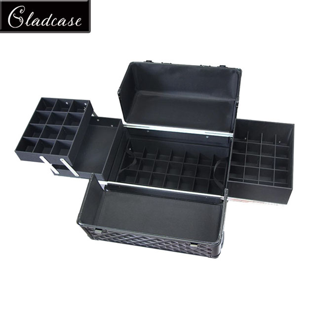 Trays : 3 trays in polywood covered with nylon fabric , with the adjustable and removable dividers in the trays .